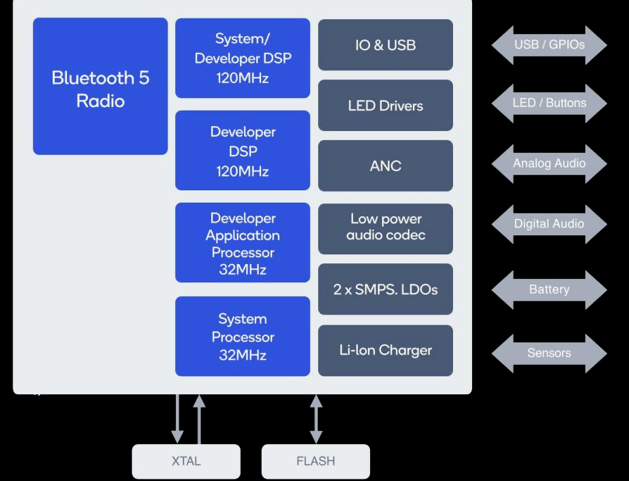 سیستم روی تراشه (SoC) Qualcomm QCC5124 برای پاسخگویی به نیازهای دستگاههای کوچک برای تجربه گوش دادن بلوتوث بیسیم قوی، با کیفیت بالا و مصرف انرژی کم برای پخش طولانیتر صدا طراحی شده است. معماری QCC5124 برای عملکرد بالا با مصرف انرژی کم طراحی شده است. در مقایسه با فناوری قبلی خود، مصرف انرژی را می توان تا 65 درصد کاهش داد و تقریباً در همه حالت های عملیاتی پخش صدا را طولانی تر می کند.